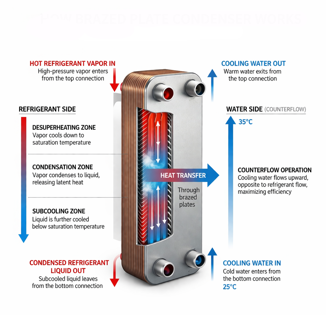 A brazed plate condenser efficiently transfers heat by directing hot fluid or refrigerant through a series of thin, corrugated metal plates, while a cooling medium flows on the opposite side. The corrugated plates maximize surface area and induce turbulence, enhancing heat transfer within a compact footprint. As heat moves through the metal plates, the fluid temperature drops and vapor condenses, while the cooling medium carries away the absorbed heat. This design enables stable and rapid temperature control, high thermal efficiency, and reliable operation in systems such as HVAC, refrigeration, data center cooling, and industrial applications, making brazed plate condensers an effective solution where space, performance, and durability are critical.