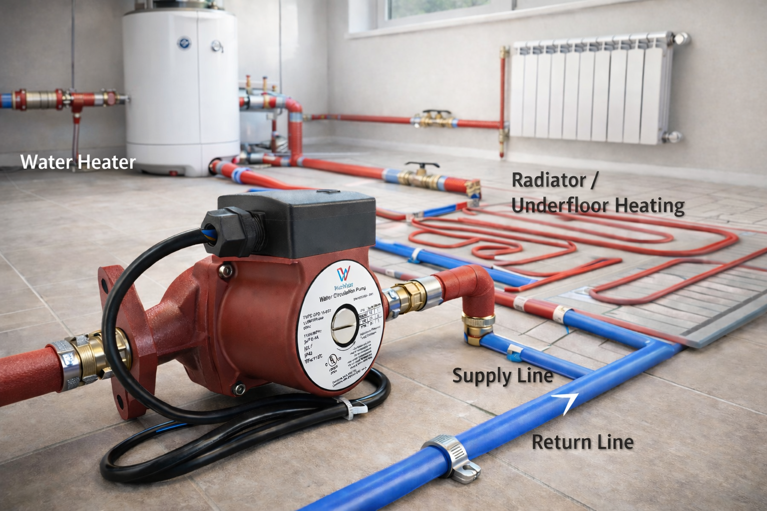 In hydronic heating systems, heating circulation pumps create the pressure differential required to move heated water through a closed-loop piping network. The pump draws water from the return line, increases its pressure, and delivers it to the supply line, allowing thermal energy to be distributed efficiently to connected heating devices.
