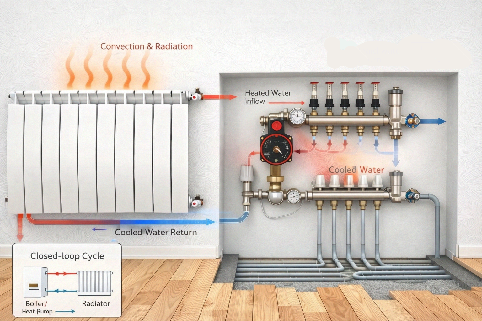 Radiators operate as heat exchange components within a closed-loop heating system. Heated water produced by a boiler, heat pump, or central heating unit flows through internal channels inside the radiator. As the hot water circulates, thermal energy is transferred from the radiator surface to the surrounding air through convection and radiation.