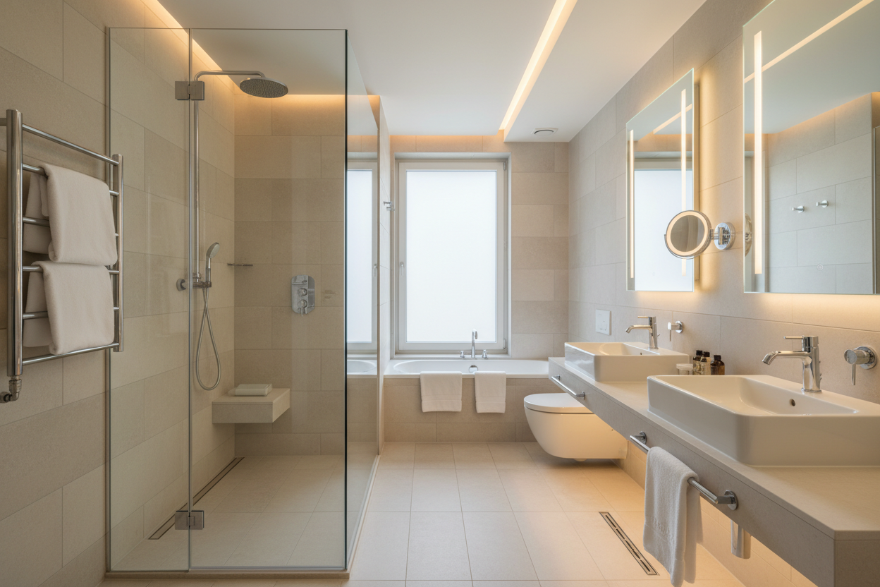 Hotels and resorts are multi-functional hospitality environments that provide accommodation, leisure, and service facilities for short-term and long-term guests. These environments typically include guest rooms, bathrooms, swimming pools, spas, restaurants, and shared public spaces.