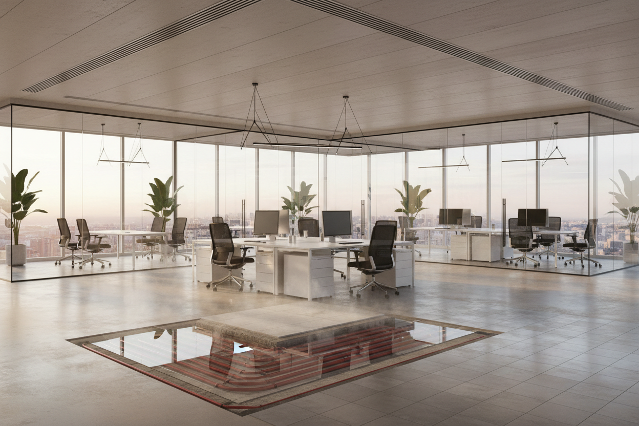Underfloor heating systems provide comfortable and evenly distributed indoor warmth while maintaining a clean and unobtrusive office layout.