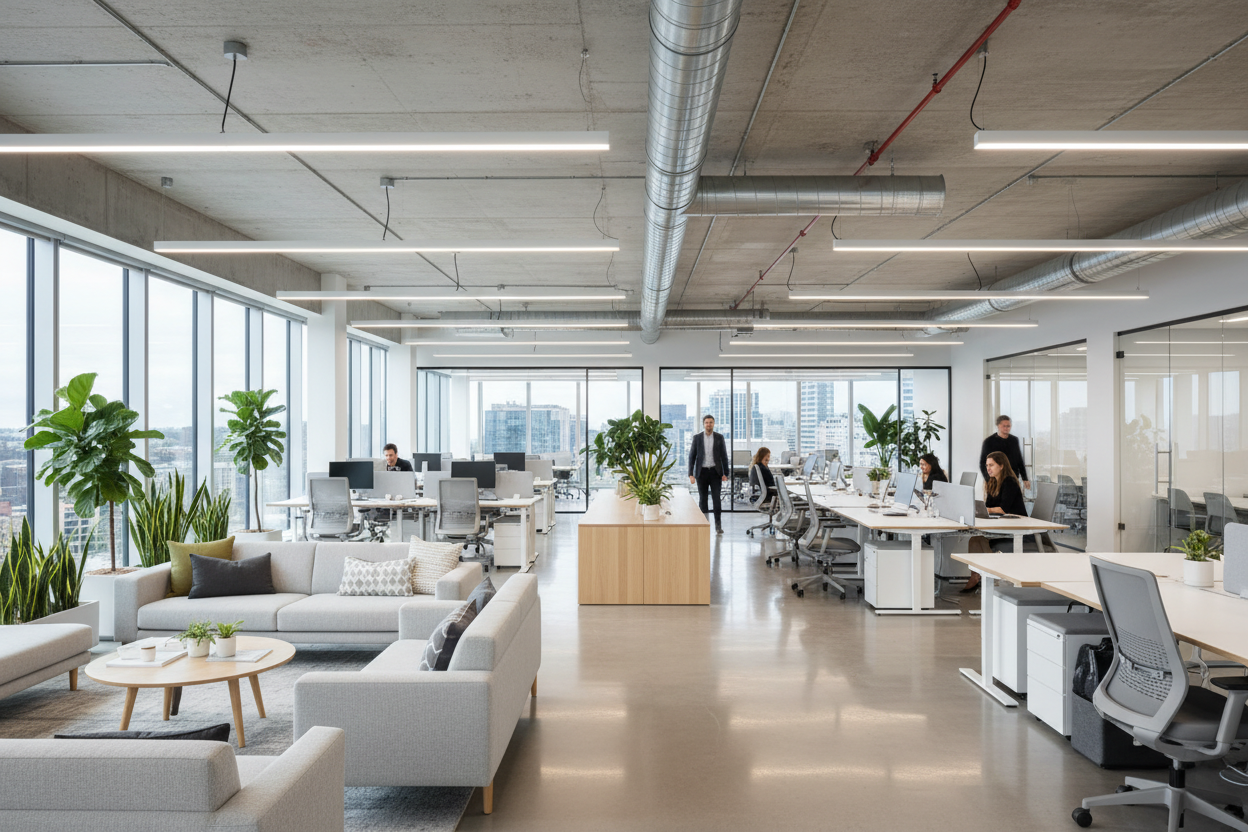 Office buildings are indoor working environments designed to support daily business operations, accommodating employees, visitors, and shared facilities. These spaces typically include offices, meeting rooms, rest areas, and service areas that require stable indoor comfort throughout regular working hours.
