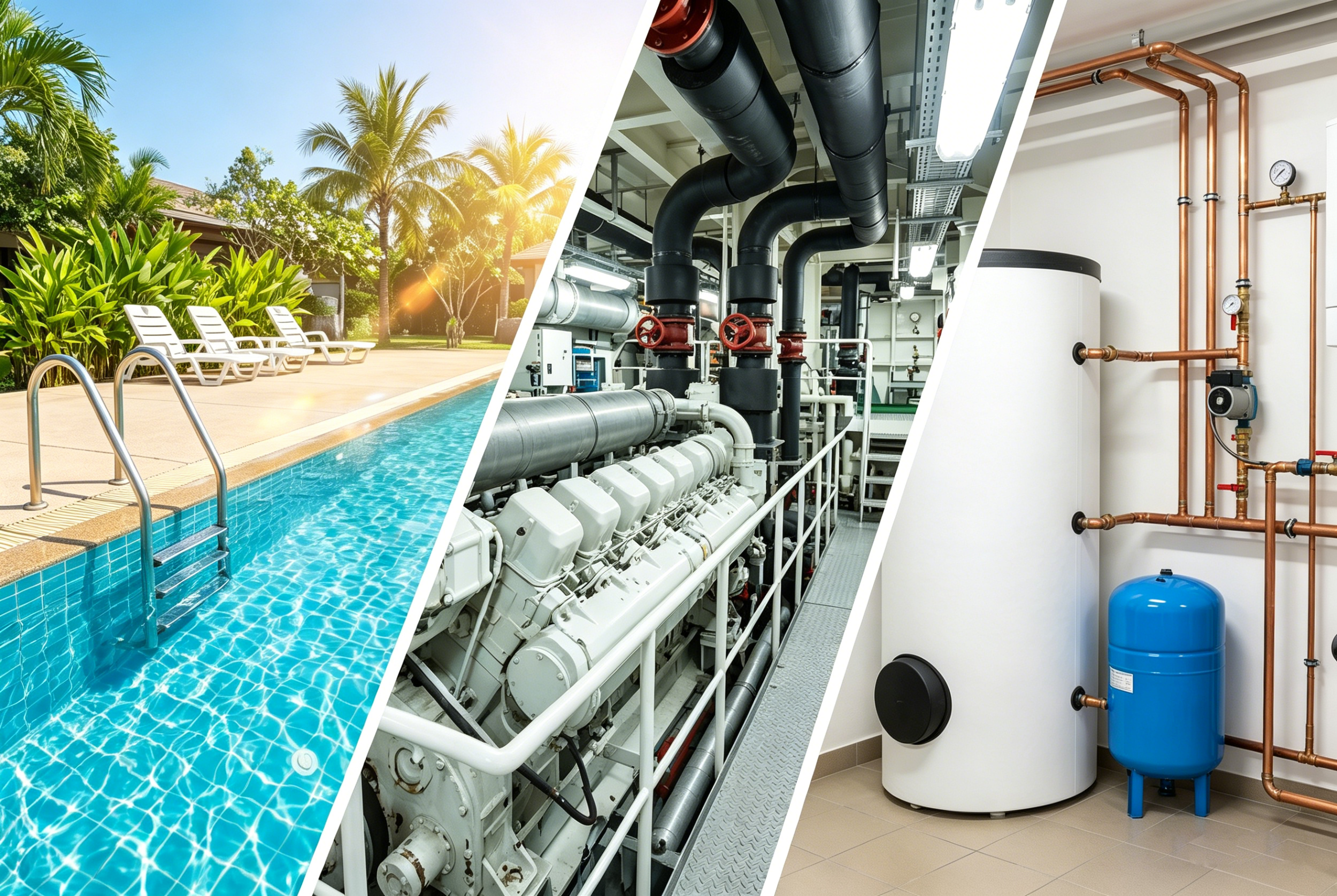Our product range supports a variety of heating and cooling needs, including swimming pool temperature control, marine engine and oil cooling, and domestic hot water systems. Each unit is engineered to deliver efficient heat transfer, long service life, and dependable operation under demanding operating conditions.